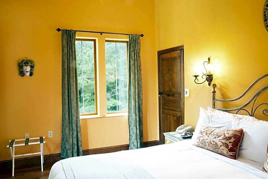This suite features a separate seating area with a sofa bed, a flat-screen TV, and a fireplace. Cable channels and WiFi access are provided.